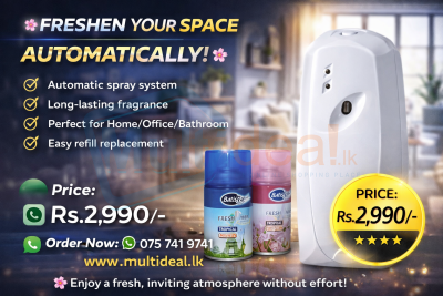 Fresh Matic Automatic Air Freshener is the perfect solution to keep your home, office, bathroom, or shop smelling fresh all day. This automatic spray system releases fragrance at regular intervals, providing long-lasting freshness without manual effort. Easy to install and refill, it is ideal for modern Sri Lankan homes and workplaces. Available now at the best price in Sri Lanka from Multideal.lk with fast ordering via WhatsApp.